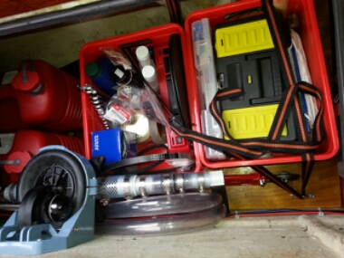 So langsam füllen sich die Stauräume. Hier das Werkzeug und die Ersatzteile (meist für den Motor). Dahinter zwei Reservekanister Diesel.