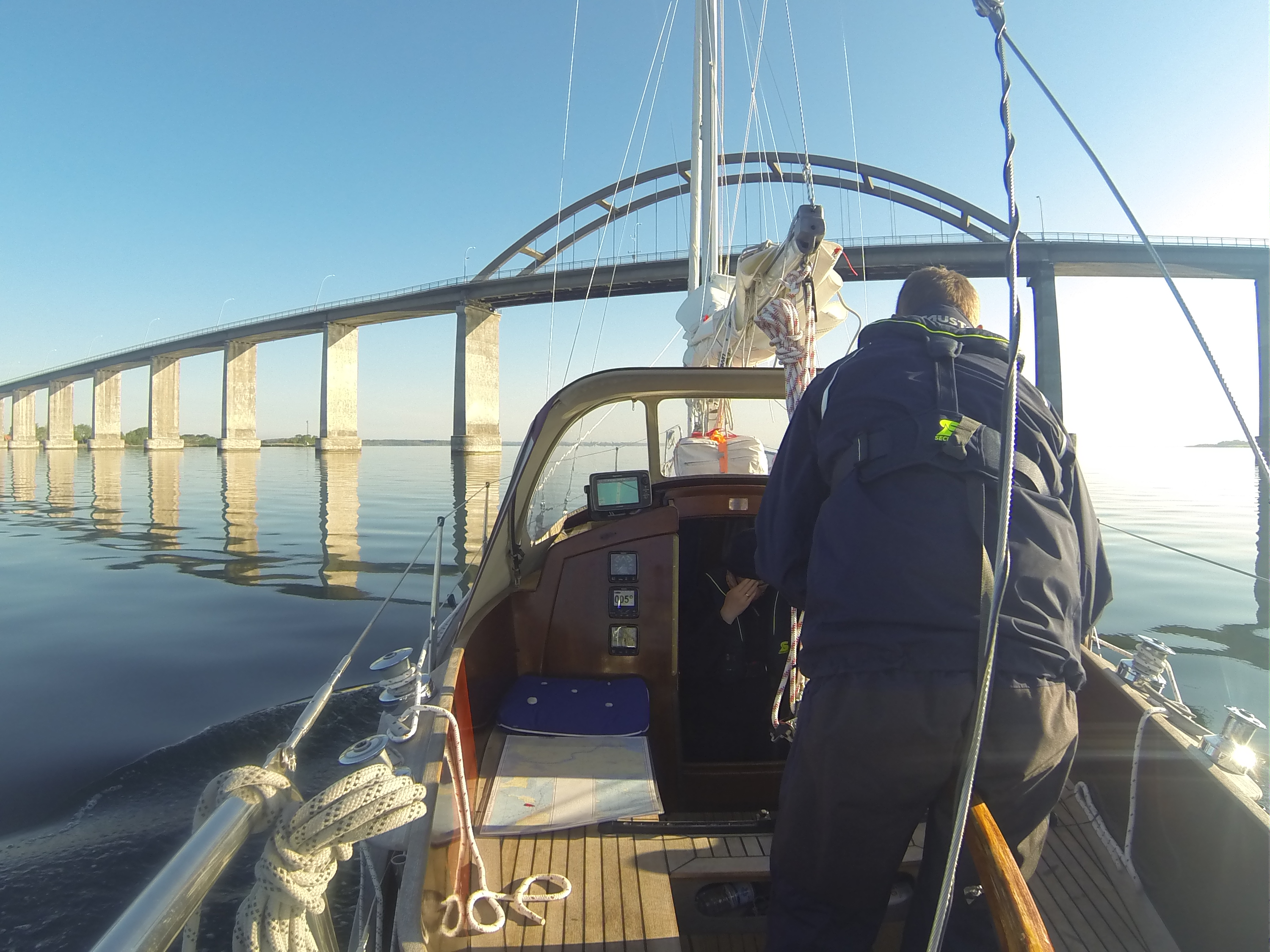 Bei Windstille und klarer Luft motoren wir um ca. 07:30 Uhr aus dem Hafen. Erstmalig überwacht durch die am Heckkorb angebrachte GoPro-Videokamera. Leider ist die Akkulaufzeit trotz Zusatzakku miserabel, daher reicht es nur für kurze Videosequenzen oder regelmäßige Fotos.