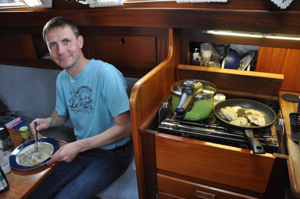 Unser Liegeplatznachbar ist ein aktiver Fischer, den wir beim Ausnehmen seines Fangs beobachten. Logische Entscheidung: Es gibt frischen Fisch. Durch ein Missverständnis zwischen dem Fischer und mir finden wir in der Tüte jedoch keine praktischen Filets (damit meine ich auch keine Fischstäbchen) sondern nur vier grob ausgenommene Fische. Hmmm, bis Micha eigenen Fisch angelt, muss halt erst mal das Filetieren perfektioniert werden.