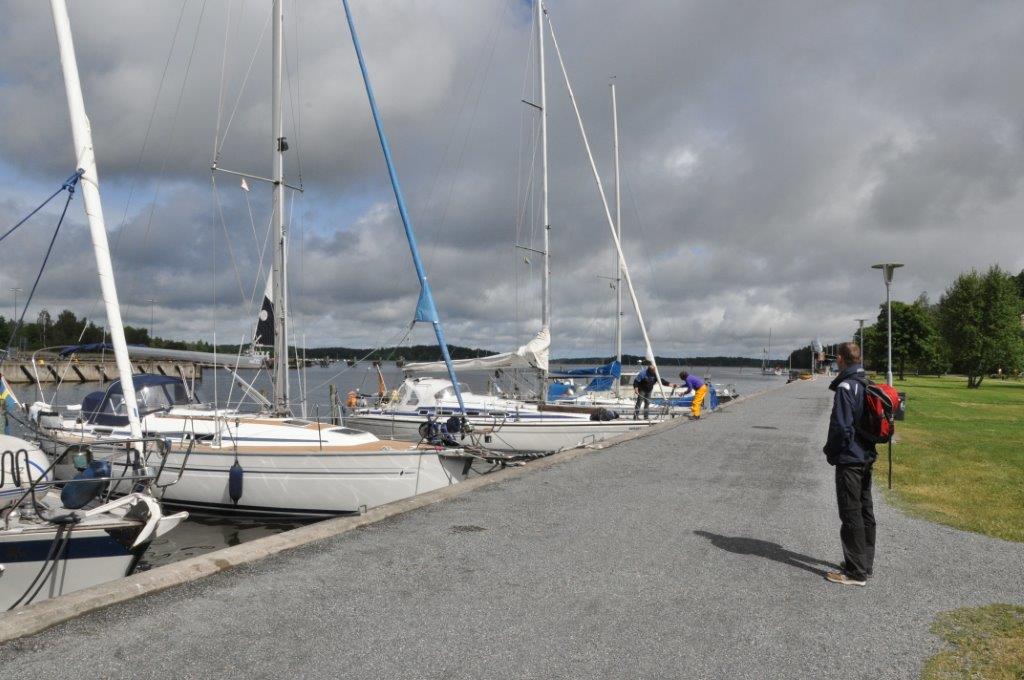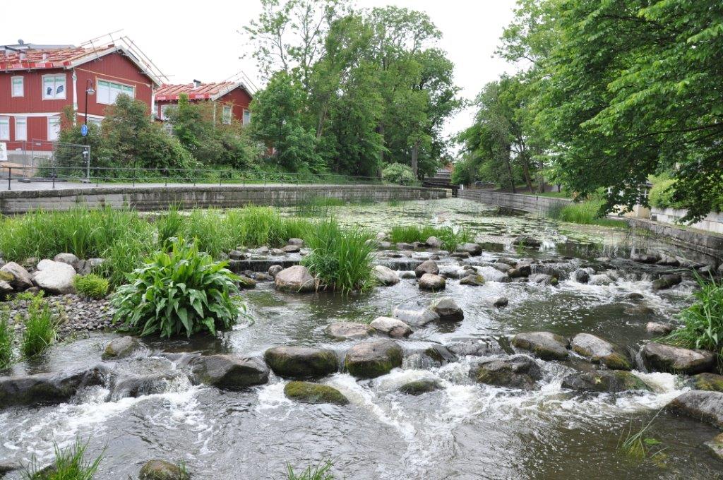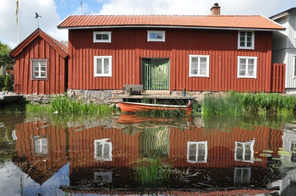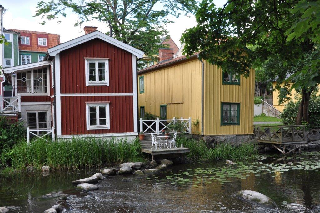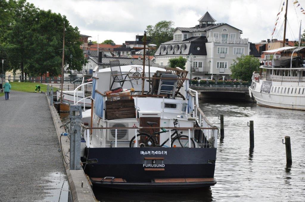Eine schmuckes Städtchen, das uns sehr gefällt. Viele renovierte Holzhäuser, gemütliche Cafés, zwei urige Pubs, ein Fischrestaurant mit sehr leckerem Fisch, ein plätschernder Bach mit gemütlichen Ecken und ein Systembolaget. Ein ganzer Laden nur für alkoholische Getränke über 3,5 % vol. Wir hatten uns schon über die türkisfarbenen Tüten gewundert, die jeder zweite Passant bei sich trug. Perfekt. Nun können wir unseren wirklich spärlichen Weinvorrat auffüllen (beim Bunkern in Kappeln saß uns die Zeit im Nacken) – schließlich steht Midsommar vor der Tür. Und man weiß ja nie…