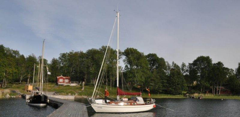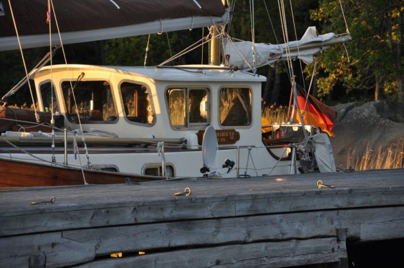 Wir wandern weiter zur Bucht im Osten der Insel, die noch immer voll ist, und entdecken das finnische Boot aus Nörrtälje. Die Crew hat am Heck von einem anderen Boot (welches selbst mit Heckanker an einem Steg liegt) festgemacht. Gute Idee, aber wir liegen besser.