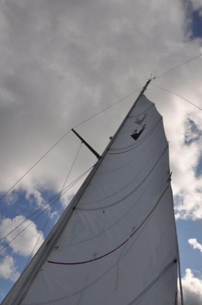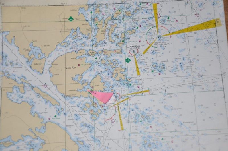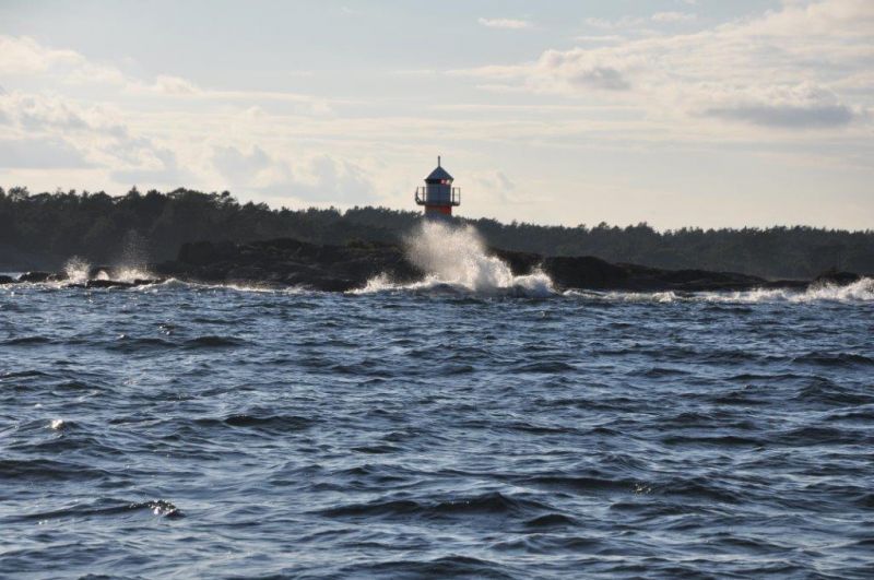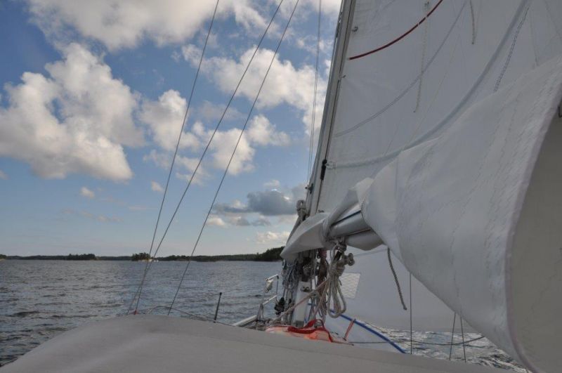 Kurz nach der Mittagszeit kommen wir los. Der vorhergesagte Ostwind dreht in dem Fjord auf Südost. Genau von vorne. Wir setzen bald die Segel und kreuzen gegenan. Der Wind weht sehr unterschiedlich in Stärke und Richtung. Entsprechend sieht der Track aus: Die Zacken ähneln teilweise eher einer Zipfelmütze als einem Sägezahn.