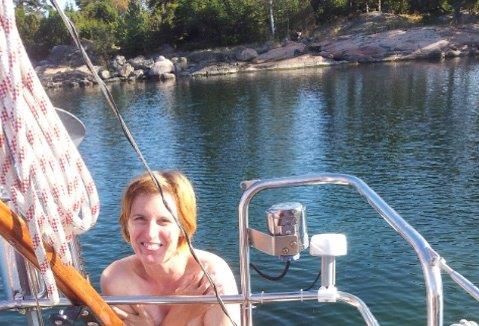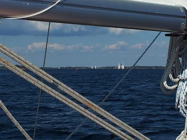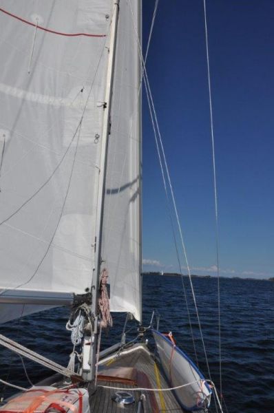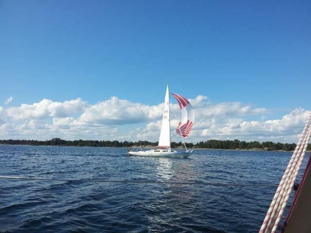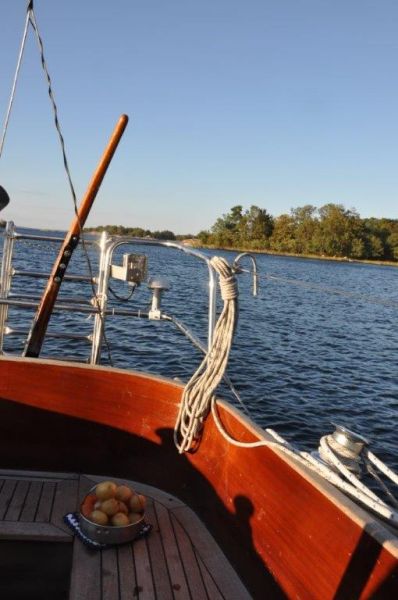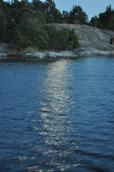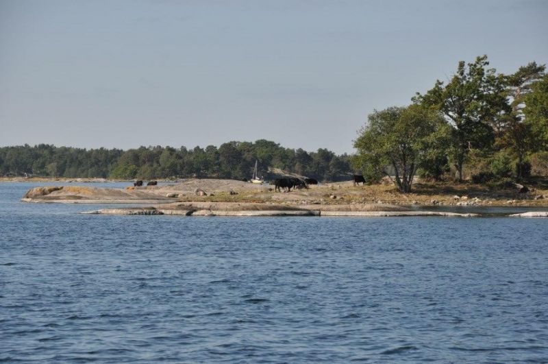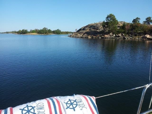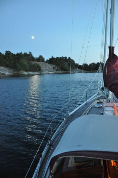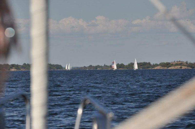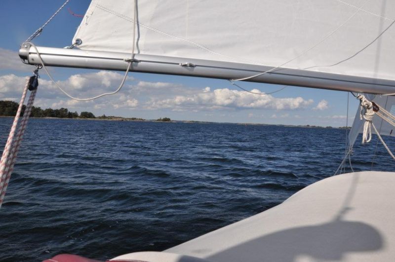 Der Wind ist bis zum Nachmittag mit 5 bis 6 kn aus Süd bis Südost vorhergesagt. Dann soll er etwas zunehmen. Auf dem Schenkel Richtung Osten kommen wir zwar mit einer guten Geschwindigkeit voran, aber die noch geringe Windgeschwindigkeit wird auf dem Vorwindkurs nicht so toll sein. Daher entscheiden wir uns für das in den Schären liegende Fahrwasser. Falls der Wind doch nachlässt, können wir einfach abbiegen und nach kurzer Strecke unter Motor den Anker werfen.