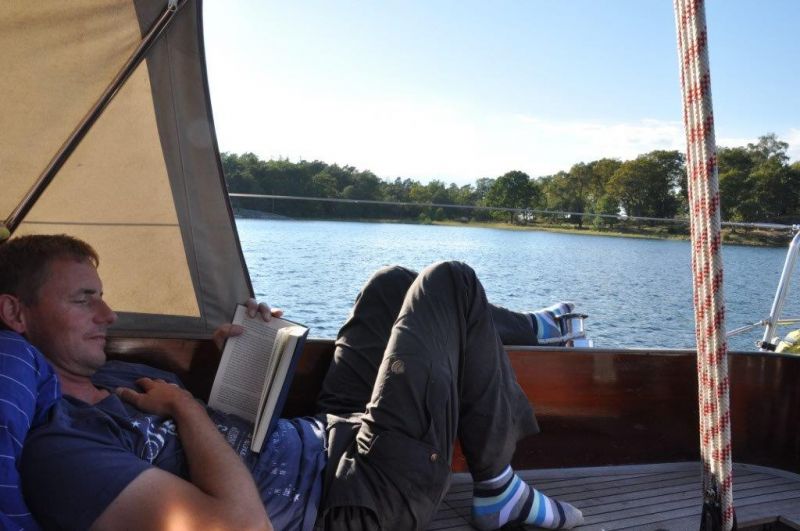 Die restliche Zeit haben wir im Cockpit genossen: Sonne tanken, Buch lesen, Kühe und Schafe anstarren, nach Adlern Ausschau halten, Gedanken schweifen lassen, Boote außerhalb der Bucht mit Fernglas verfolgen, Schokolade naschen, springende (kleine) Fische interessiert beobachten und dann lässig ignorieren, über das Abendessen nachdenken, in den Himmel sehen, sinnierend über das Wasser blicken…