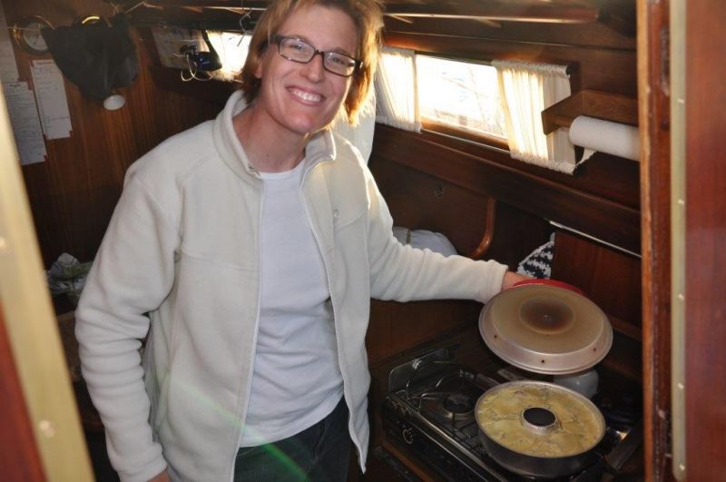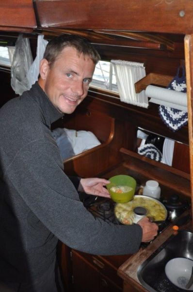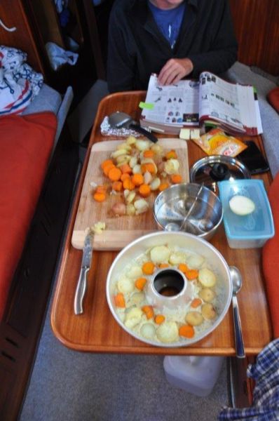 Für das Dinner haben wir den OMNIA als Auflaufform eingeweiht. Kartoffel-, Möhren- und Zwiebelauflauf mit Sahne und Käse überbacken. Naja, braun ist der Käse nicht geworden, aber goldgelb zerlaufen. Unser Zwiebelverbrauch ist übrigens enorm. Das ideale Bord-Gemüse. Der Auflauf ist gelungen; eine leckere Abwechslung in unserer Bordküche.