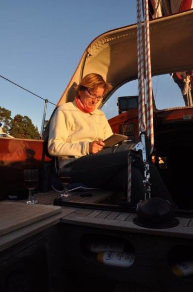 Am Abend hat der Wind auf über 12 kn zugenommen und wir schwoien in einem derart großen Winkel, dass wir im Minutenrhythmus über Achtern erst die westliche Insel mit Kühen dann die östliche Insel mit Schafen betrachten können. Es wird immer früher dunkel und wir liegen erstaunlicherweise schon um 20:45 Uhr mit Buch und e-book gemütlich in unseren Kojen.