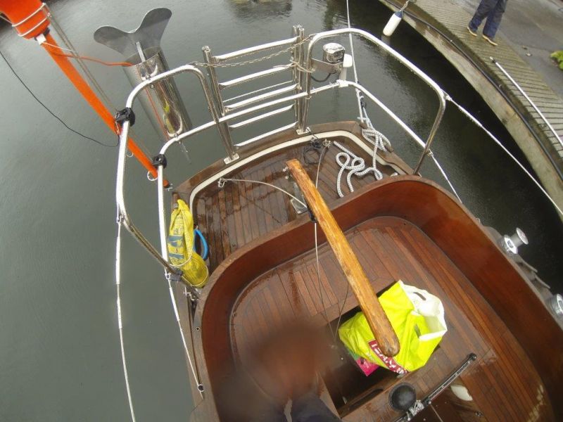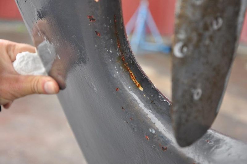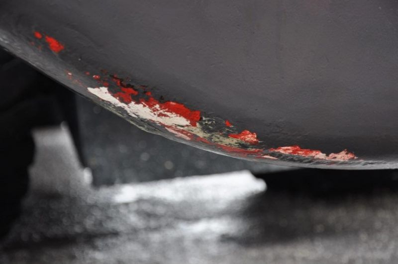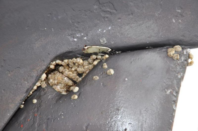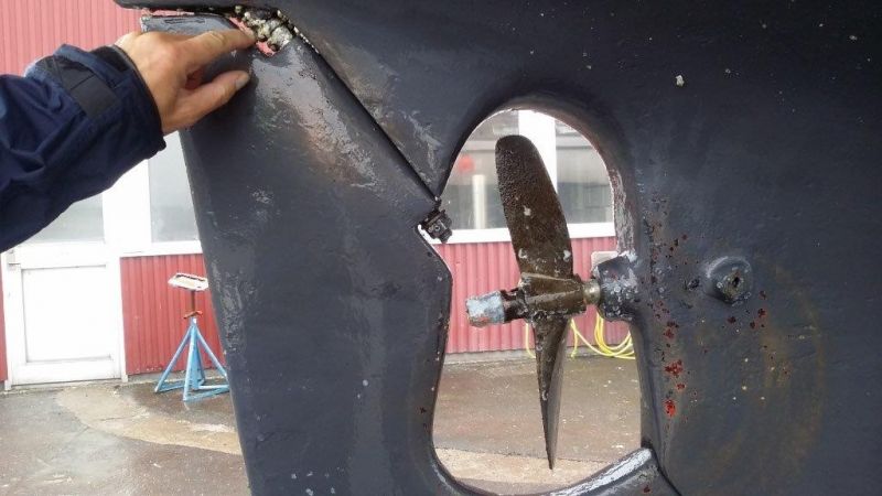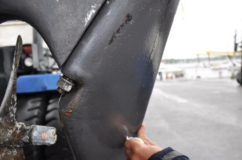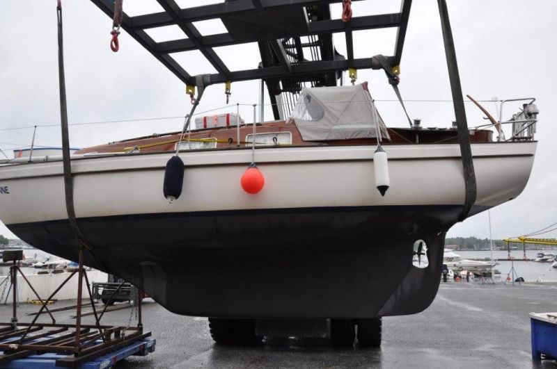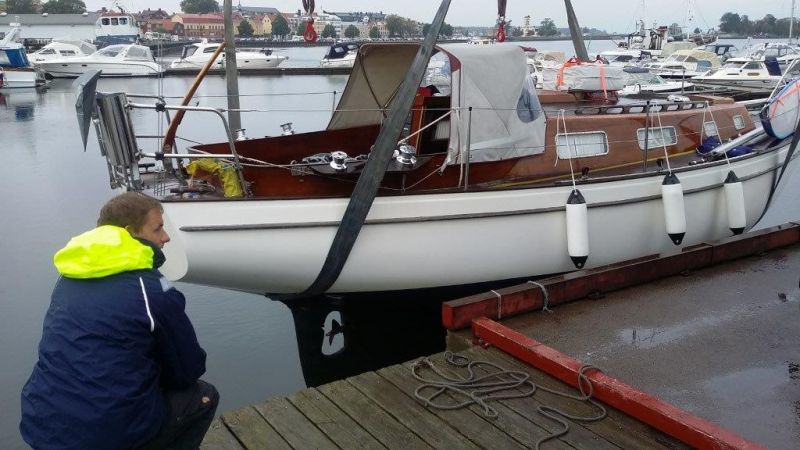 Nach dem Kranen und der Reinigung kontrollieren wir das Unterwasserschiff. Abgesehen von der kleinen Stelle am Bug, die bei der Grundberührung am Felsen kratze, sieht es sehr gut aus. Das Ruder inklusive Lager lassen wir auf jeden Fall überprüfen. Seit der Prüfung in Bullandö ist eine weitere kritische Stelle an der oberen Stoßkante dazugekommen.