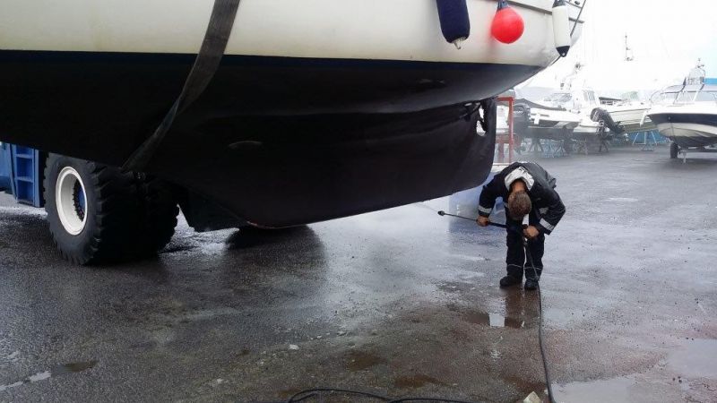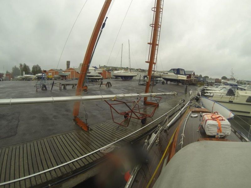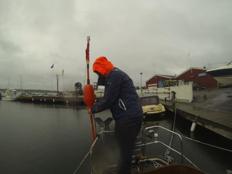 Heute kommt JANNE aus dem Wasser. Bereits gestern haben wir sie zur Pampas Marina verlegt und die Vorbereitungen erledigt. Beim Legen des Mastes, natürlich beim Herausheben aus dem Wasser und bei der Reinigung des Unterwasserschiffs bekommen wir Unterstützung von dem Personal der Werft. Es regnet bereits den ganzen Tag, doch als wir den Mast legen, schüttet es wie aus Kübeln.